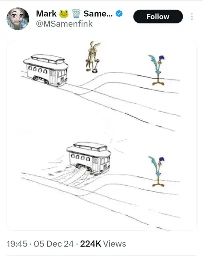 the switch wouldn’t work so roadrunner would eat all the birdseed and leave and the coyote would walk onto the tracks, scratch his head, then the level would slide into place and the trolley would run him over.