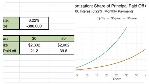 The example halfway down the post of a $400K loan fixed at 6% is a good example: A 15-year loan would have a $3,375.74 monthly payment but pay off $305,364 principle after 12 years. A 30-year would have a $2,398.20 monthly payment, but have only $134,978 paid off. A 50-year has a $2,063.74 payment only pays off $66,251 principle.