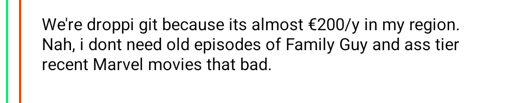 We’re droppi git because its almost €200/y in my region. Nah, i dont need old episodes of Family Guy and ass tier recent Marvel movies that bad.