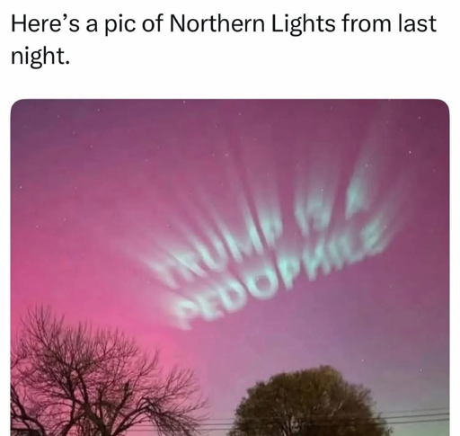 HootinNHollerin@lemmy.dbzer0.com to Political Memes@lemmy.worldEnglish · 2 days agoAreola Borealislemmy.dbzer0.comimagemessage-square1fedilinkarrow-up1302arrow-down13