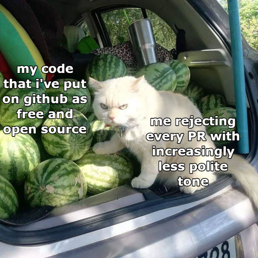 I’d probably reject PRs into my FOSS projects, because the aim is to put the code out there for other people to see and do what they want with it. I’m expressing myself, and sharing what I made; I’m not setting up a tentpole project for others to pitch in and take over on, and start managing their contributions and collaborate with them.