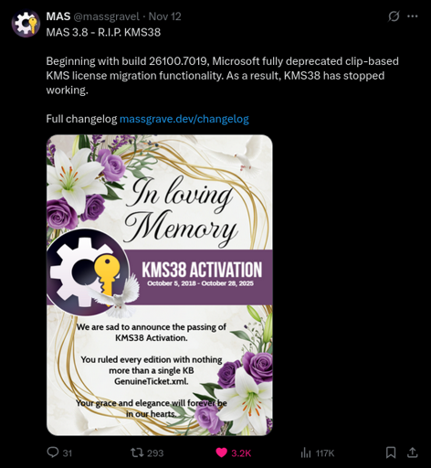 arrow-up1386arrow-down1imageMicrosoft has blocked Massgrave's KMS38 activation method for Windowsmr_MADAFAKA@lemmy.ml to Piracy: ꜱᴀɪʟ ᴛʜᴇ ʜɪɢʜ ꜱᴇᴀꜱ@lemmy.dbzer0.comEnglish · 3 days agomessage-square122fedilinkfile-text
