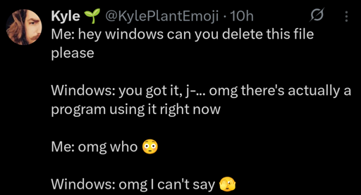 minus-squaredogs0n@sh.itjust.workslinkfedilinkarrow-up4arrow-down1·3 days agoI did this exact thing yesterday and Powertoys told me no one was using the file. Now it will just exist forever because I gave up. Obviously I deleted powertoys after it failed to help and now all I can be is glad that this isn’t my main OS.