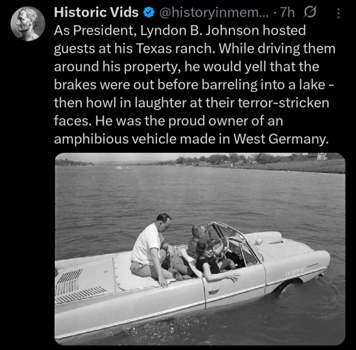 The Picard Maneuver@piefed.world to People Twitter@sh.itjust.worksEnglish · 2 days agoLBJ knew how to have funmedia.piefed.worldimagemessage-square28fedilinkarrow-up1602arrow-down19
