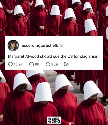 Issue is, the dominionist cult, that pushes this ultra-conservative christianity bullshit on not just the US, but on the whole world came into existence in the seventies at the latest, while The Handmaid’s Tale came out in 1985. If anything, the novel reflected about what was about to come, rather than some religious fanatics plagiarizing the book.