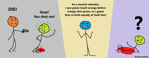 [blue, shrugging] As a neutral onlooker, I saw green insult orange before orange shot green, so I guess they’re both equally at fault here