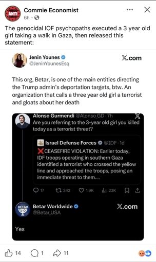 Agreed. Still, it is a pro-Israel organization that is gloating about the death of a 3-year old Palestinian girl. Very psychotic behavior. How can you say shit like that and still see yourself as one of the “good guys”??