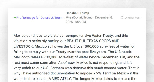 arrow-up178arrow-down1external-linkTrump threatens new tariffs unless Mexico hands over more waterplus-squaretrumpstruth.orgKing@sh.itjust.works to politics @lemmy.world · 18 hours agomessage-square19fedilink