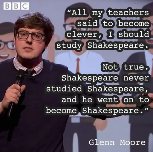 The joke comes from the fact that people say you need to study Shakespeare in order to be clever. However, Shakespeare did not study Shakespeare. He is just making a very simple joke making fun of that fact. It’s not more than that. There is no further implication. It is a simple play on words.